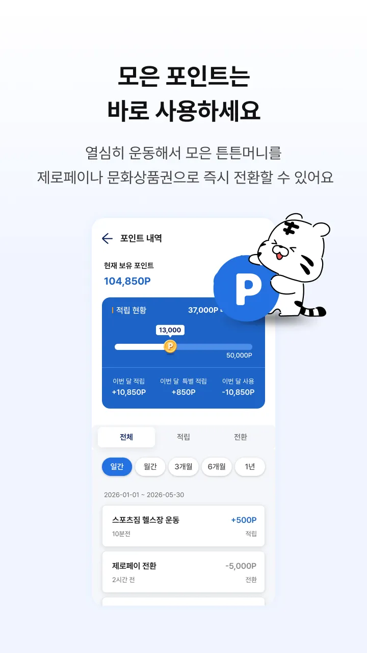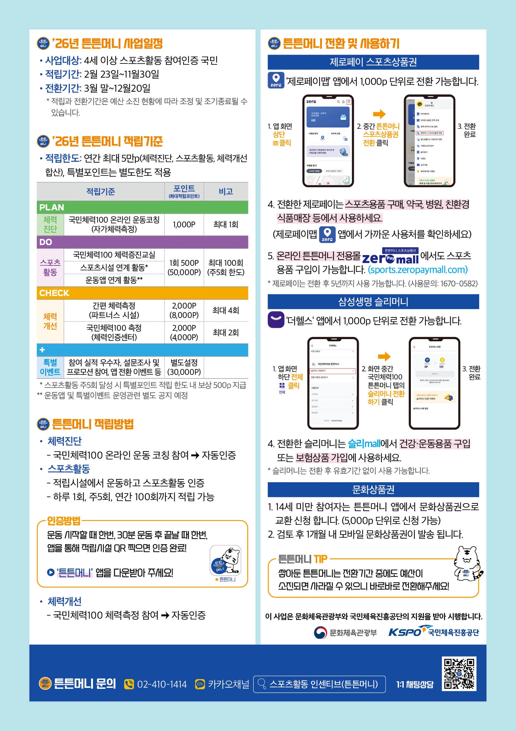 즉, 해당 튼튼머니 사업은 2026년에는 11월 30일까지 튼튼머니 포인트를 적립할 수 있고, 12월 20일까지 튼튼머니 포인트를 제로페이앱에서 제로페이로 전환하거나 온라인 튼튼머니 전용몰에서 사용할 수 있다. 이때 제로페이로 전환해 놓으면 이후 5년까지 사용할 수 있으므로 주로 제로페이 전환 방식으로 이용된다.