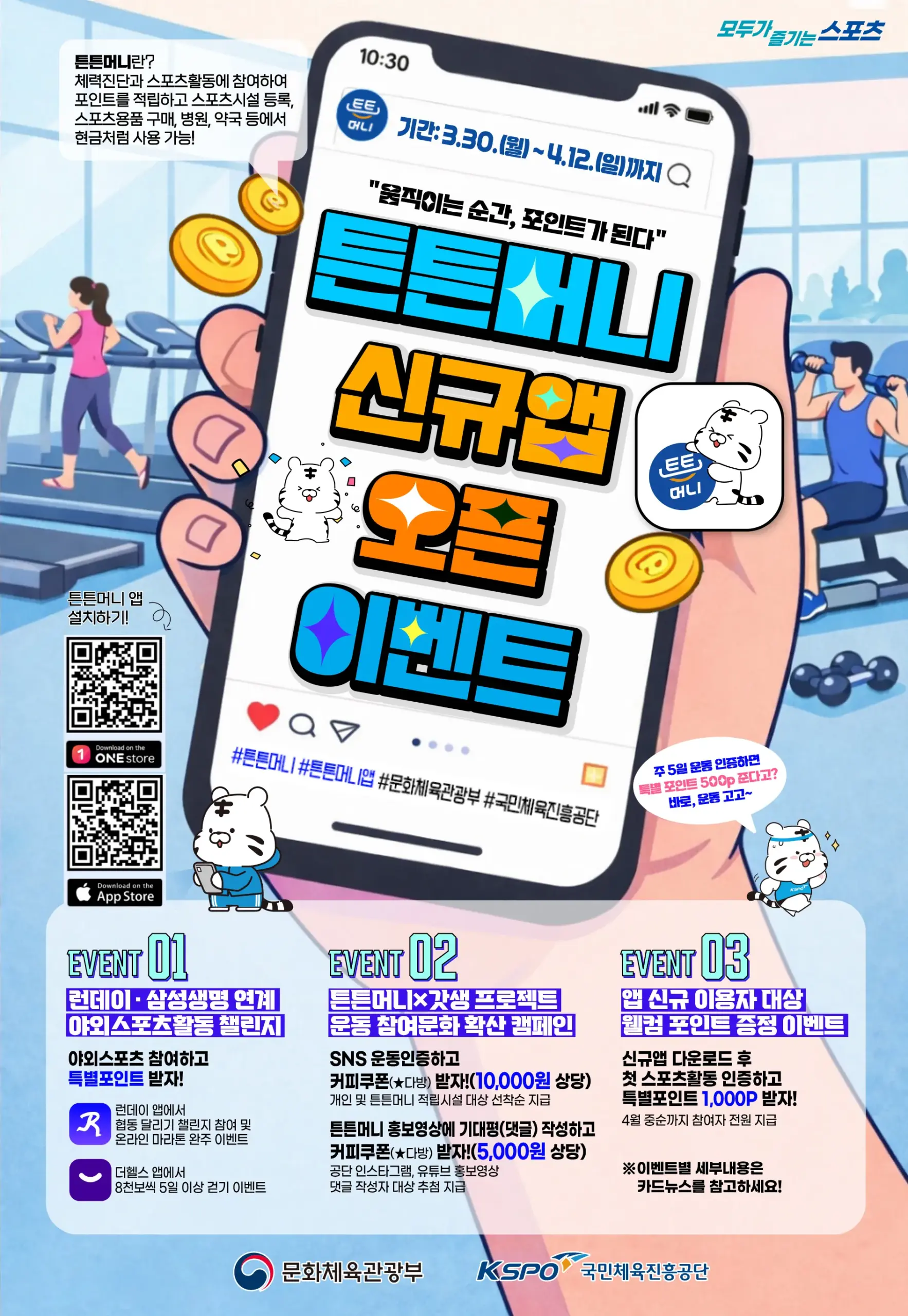 국민체력100 사업의 스포츠 활동 인센티브 제도인 튼튼머니 전용 앱인 튼튼머니가 2026년 3월 30일에 출시됐는데, 출시 시점에서 앱스토어와 원스토어에서만 다운로드가 가능하며 구글플레이에서는 추후에 다운로드를 지원할 예정이다. 다음에서 운동을 하면 포인트가 적립되는 튼튼머니 모바일 전용앱 특징부터 모바일에 설치해서 사용하는 방법까지 자세히 살펴본다.