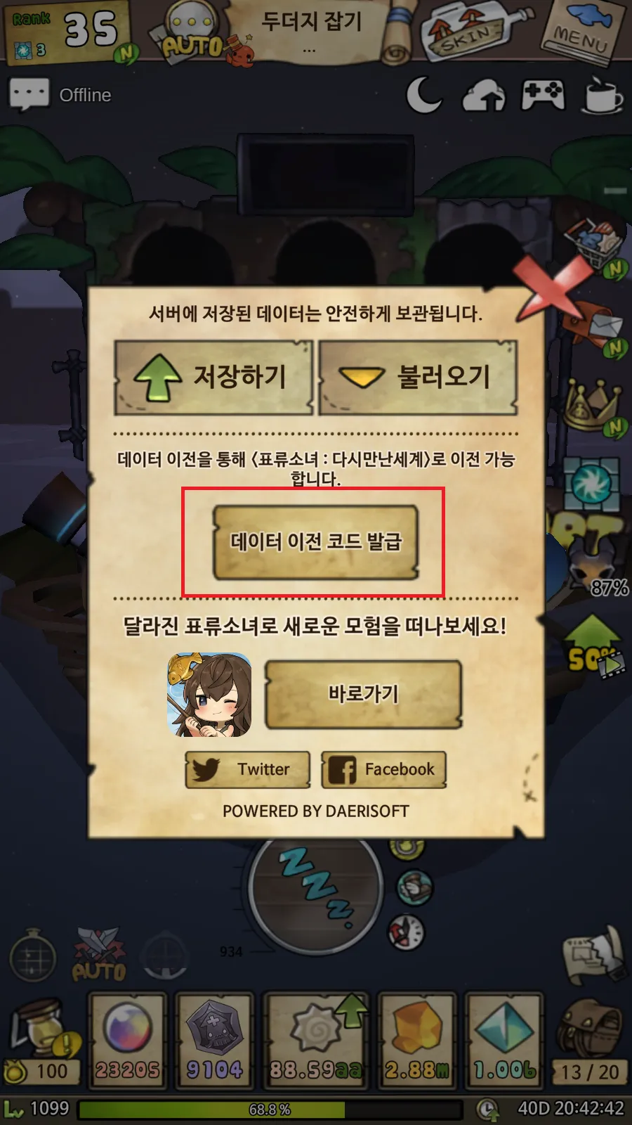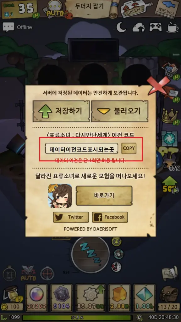 즉, 기존 표류소녀를 최신 버전으로 업데이트한 후에 게임 내에서 저장하기 또는 불러오기 버튼을 누르면 데이터 이전 코드 발급 버튼이 활성화하는데, 여기에서 발급된 데이터 이전 코드를 Copy 버튼을 활용해서 복사할 수 있다.
