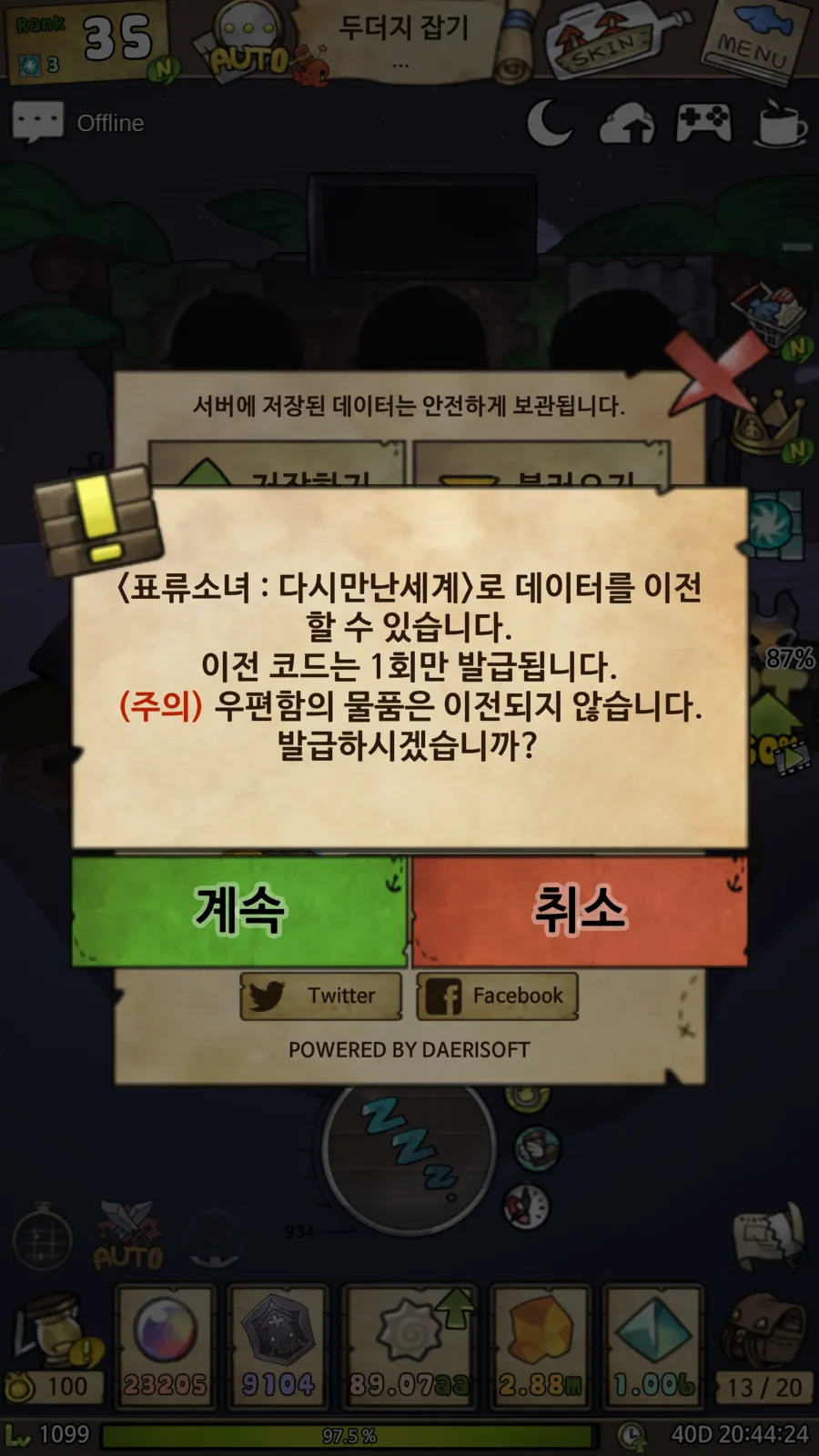 최신 버전의 표류소녀 다시 만난 세계를 모바일에 설치한 후에 구글 또는 애플 계정으로 로그인한 다음에 최종적으로 저장하기.불러오기 버튼을 누르면 카피한 데이터 이전 코드를 입력할 수 있다.